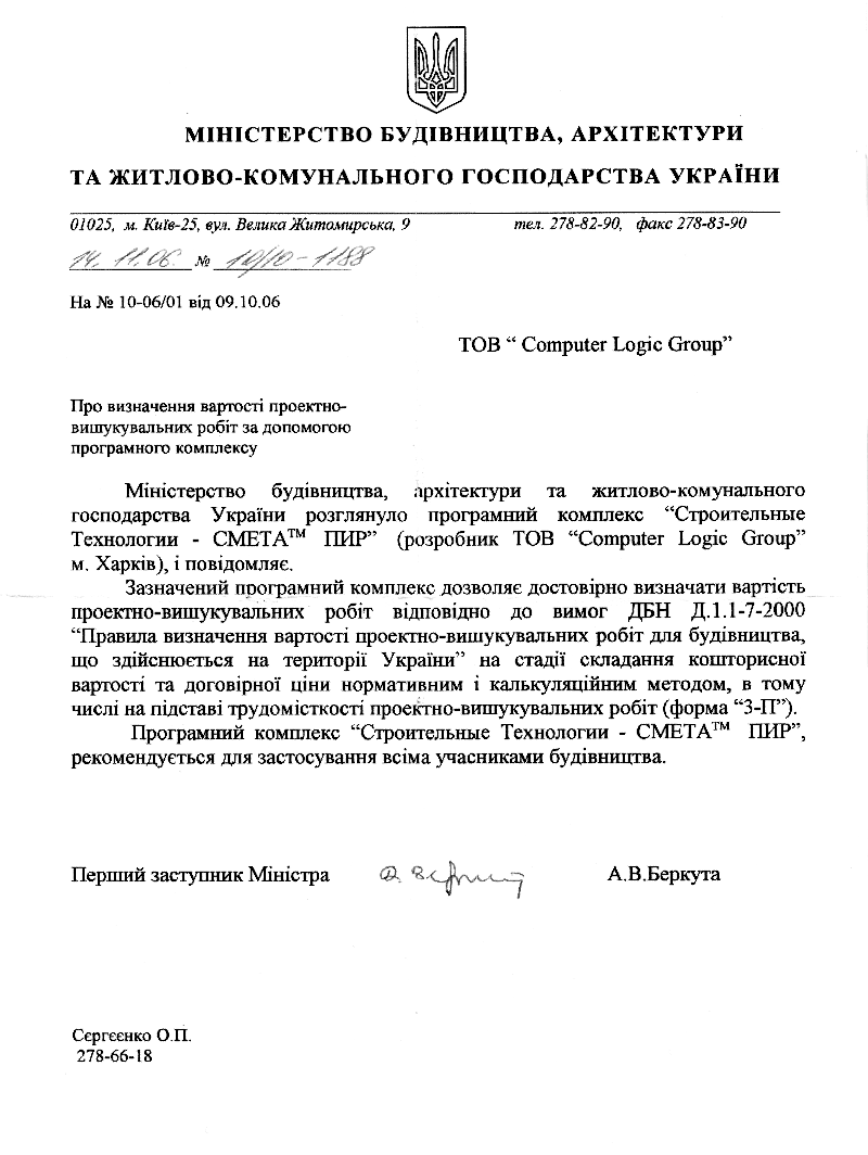 Лист Міністерства будівництва, архітектури та житлово-комунального господарства України від 14.11.2006 № 10/10-1188 «Про розгляд програмного комплексу «ПК Будівельні Технології – КОШТОРИС™ ПВР».