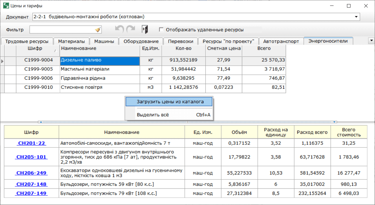- Вид сортировки ресурсов: по наименованию, по шифру, по убыванию сметной стоимости.