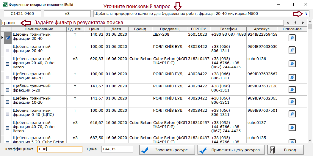 - В результатах поиска отображаются полные названия позиций нормативной базы.