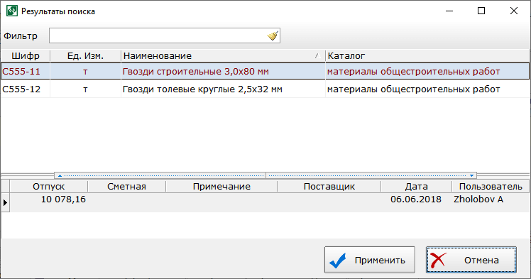 - При составлении локальной сметы Вы можете выбирать позиции из пользовательских сборников и тут-же добавлять их в смету, не открывая пользовательскую сметную базу. Для этого в окне локальной сметы нажмите F6. В появившейся строке в поле шифр введите часть наименования пользовательской нормы или ресурса, например, «арматура» и нажмите клавишу Enter. Программа выведет на экран все пользовательские нормы и ресурсы, в наименовании которых встречается указанный поисковый запрос. Выберите нужную норму или ресурс в окне «Результаты поиска». В нижней части окна выберите цену и нажмите кнопку «Применить» чтобы добавить эту позицию в локальную смету, рис. 4.