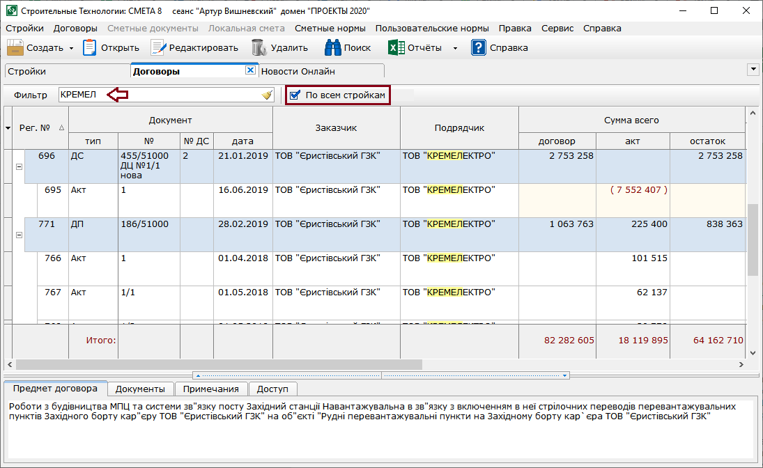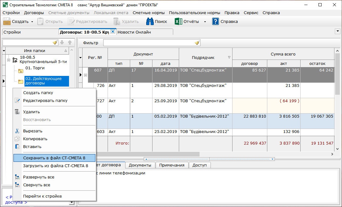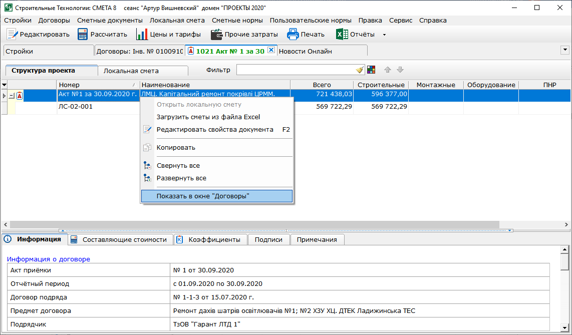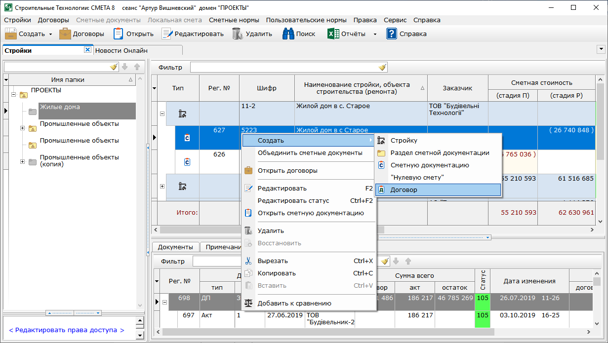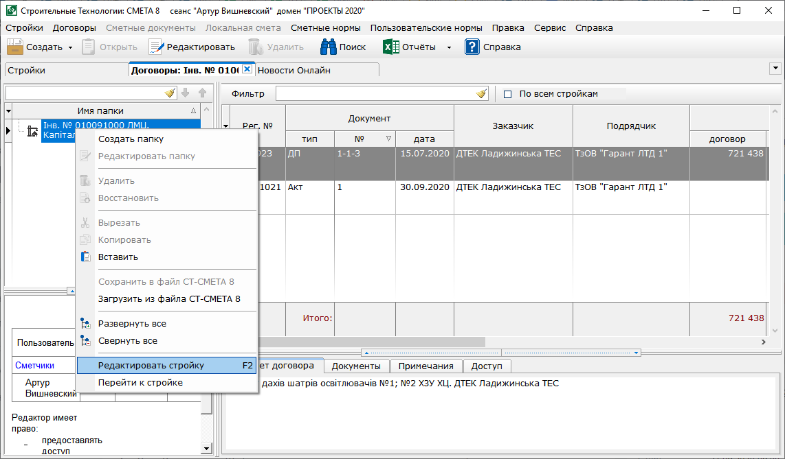 - В контекстное меню в окнах строек и договоров добавлены команды "Вырезать", "Копировать", "Вставить".
