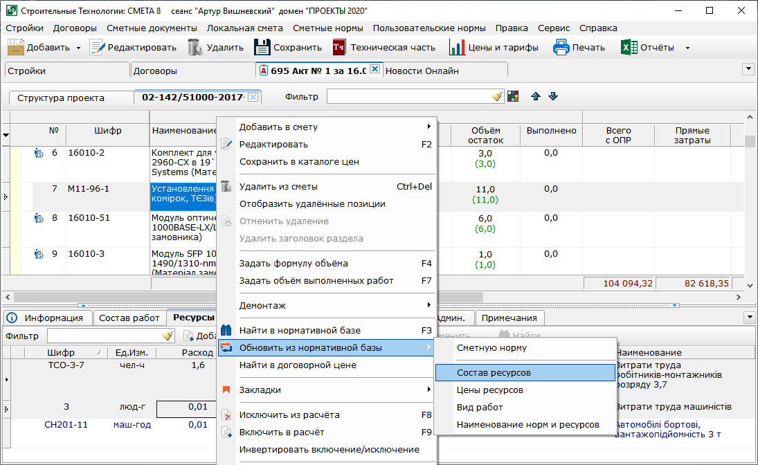 - Улучшена функция сравнения акта с договорной ценой. В частности, на вкладке «Отклонения ресурсов» отображаются только те ресурсы акта приемки, в которых зафиксировано отклонение от договорной цены.