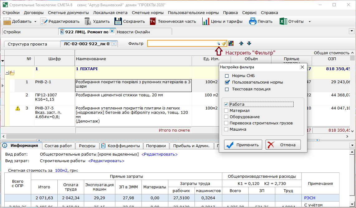 - В сметах на ремонт и реконструкцию, для позиций сборников КНУ на строительные работы, реализовано автоматическое применение коэффициентов к затратам труда основных рабочих и времени эксплуатации строительных машин и механизмов.